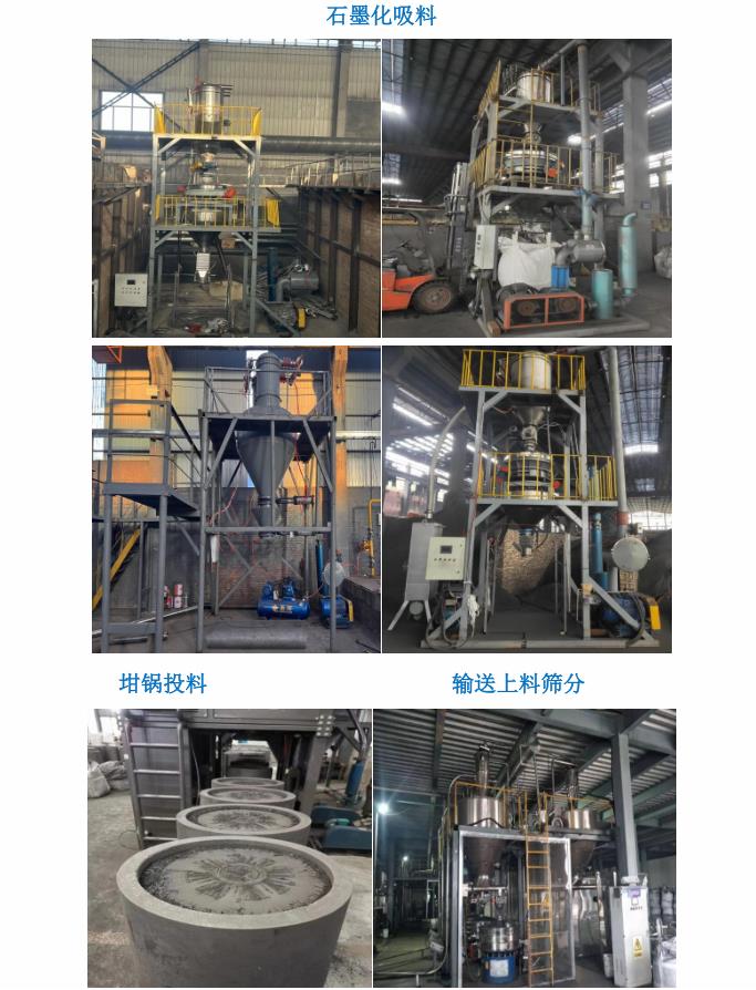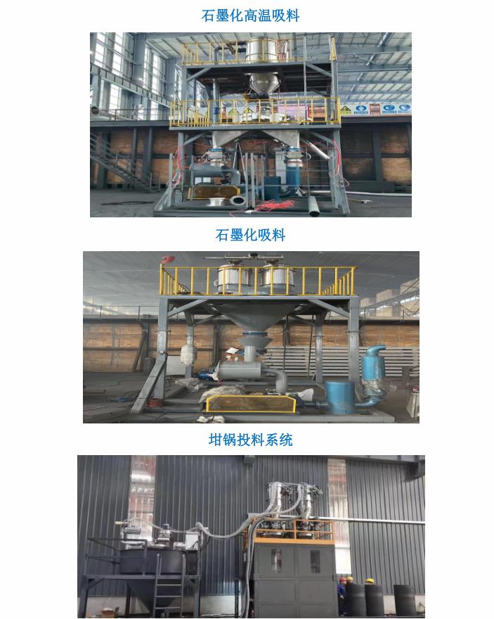 公司針對新能源、新材料、石墨化預碳化、鋰電負極行業等設計的生產線,大功率真空吸料機,輸送距離最達遠可達170米,260°高溫料經過冷卻系統可直接裝進噸包。