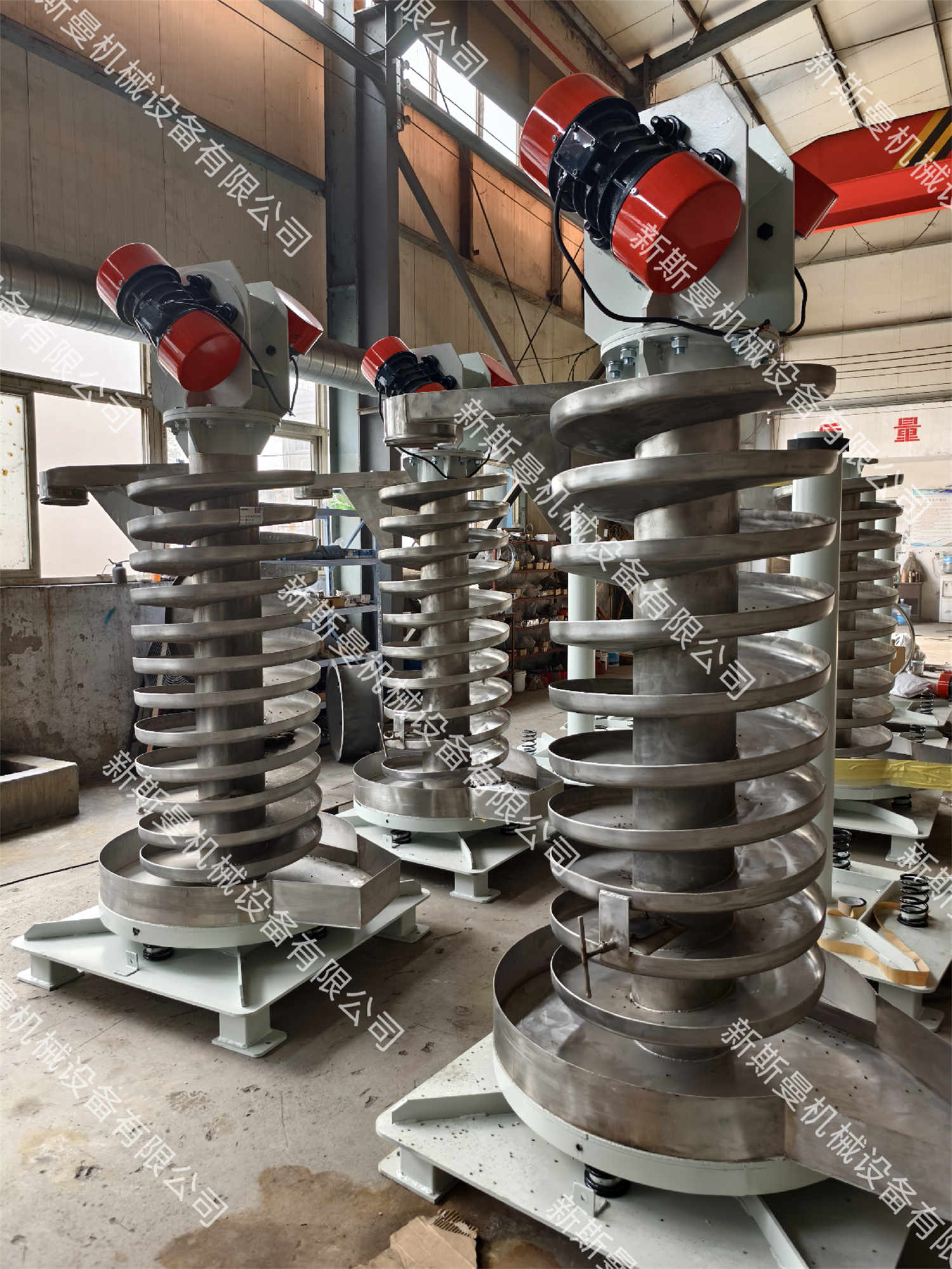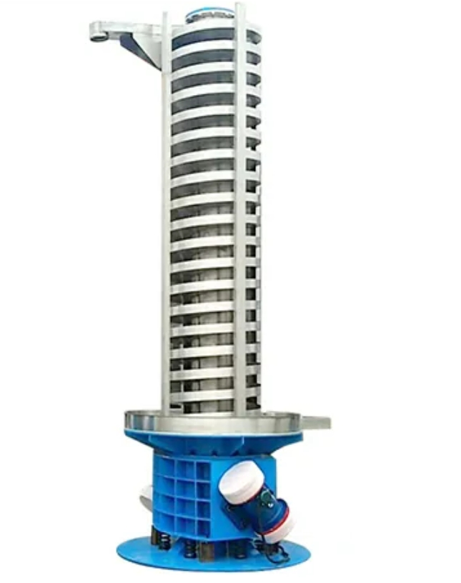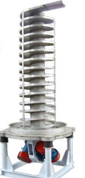 垂直提升機的驅動裝置振動電機安裝在輸送塔下部,兩臺振動電機對稱交叉安裝,輸送塔由管體和焊接在管體周圍的螺旋輸送槽組成,輸送塔座于減振裝置上,減振裝置由底座和隔振彈簧組成。當垂直提升機工作時,根據雙振動電機自同步原理,由振動電機產生激振力,強迫整個輸送塔體作水平圓運動和向上垂直運動的空間復合振動,螺旋槽內的物料則受輸送槽的作用,作勻速拋擲圓運動,沿輸送槽體向上運動,從而完成物料的向上(或向下)輸送作業,因此本設備也被成為振動垂直輸送機。
