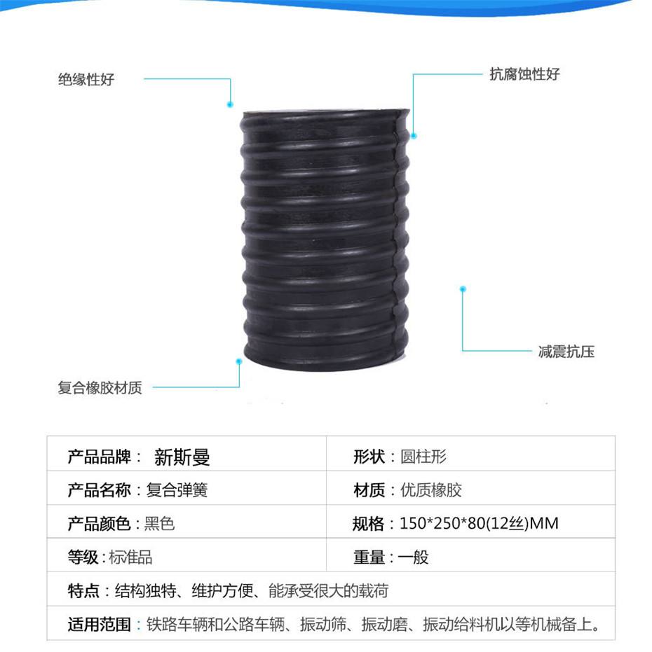 咨詢熱線:15537323577 復(fù)合彈簧:是由金屬螺旋彈簧和橡膠復(fù)合在一起的園筒狀彈性體。該產(chǎn)品優(yōu)于金屬彈簧,具有抗腐蝕性好、壽命長等優(yōu)點(diǎn),與其它彈簧相比,減振能力強(qiáng),緩沖效果好。