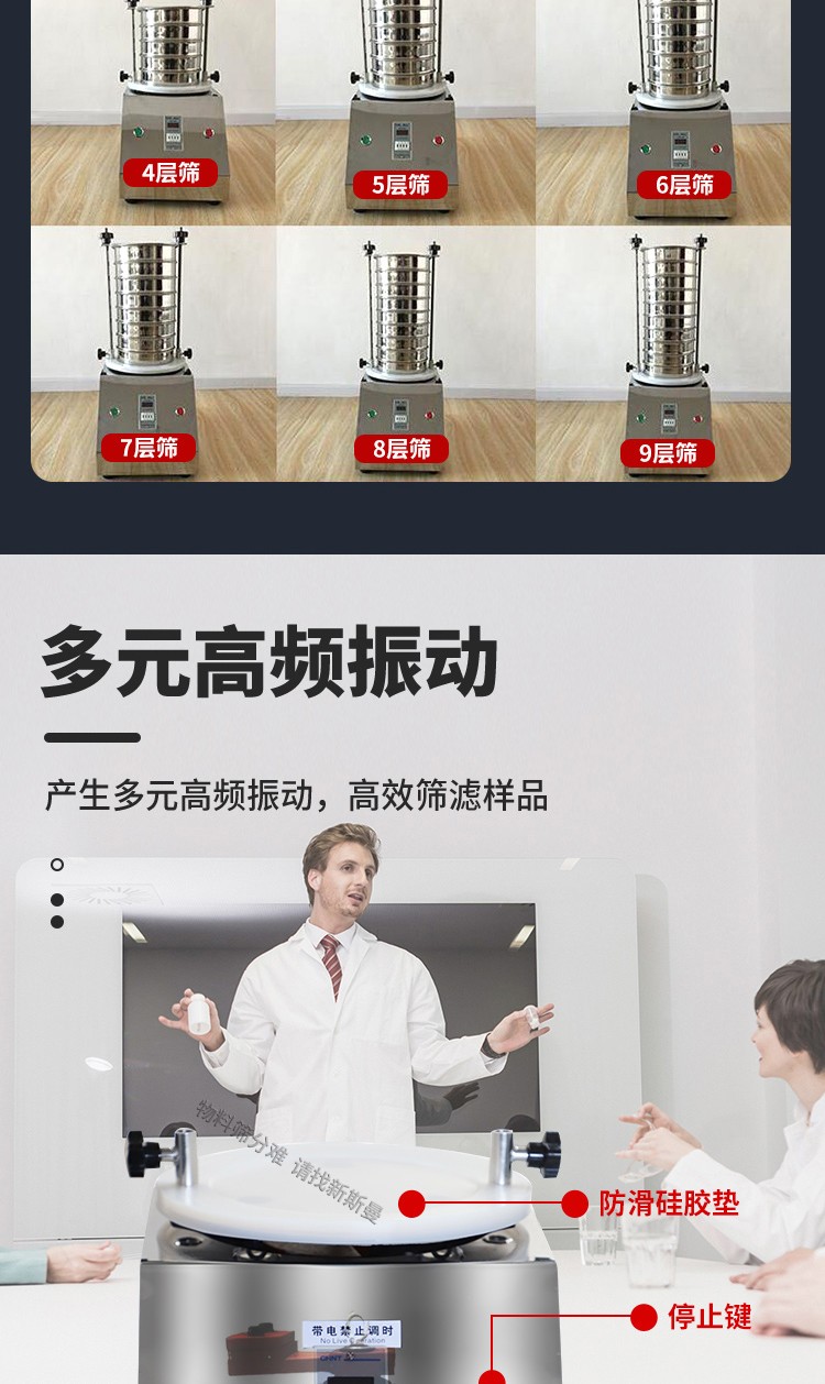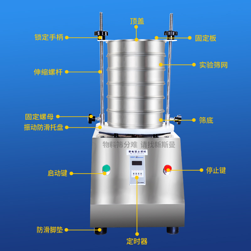 5. 根據(jù)物料性質(zhì)及投料量,在定時(shí)器上設(shè)定運(yùn)行時(shí)間,然后打開(kāi)電源開(kāi)關(guān),標(biāo)準(zhǔn)試驗(yàn)篩即開(kāi)始工作。