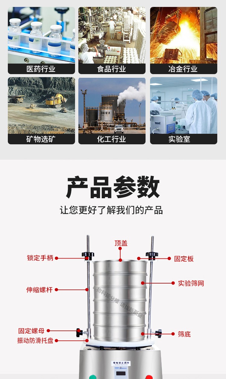 標(biāo)準(zhǔn)檢驗(yàn)篩(試驗(yàn)篩)又叫標(biāo)準(zhǔn)篩,是具有標(biāo)準(zhǔn)篩孔的篩析工具,又是檢驗(yàn)其他粒度檢測(cè)方法的工具或依據(jù),實(shí)驗(yàn)室篩分所用的篩子是按表中有關(guān)標(biāo)準(zhǔn)制成的篩孔大小不一的試驗(yàn)套篩,即標(biāo)準(zhǔn)篩。標(biāo)準(zhǔn)篩是由直徑15~450mm,高為25~50mm的篩框和篩網(wǎng)組成。篩框不銹鋼板制成,實(shí)驗(yàn)室篩分用套篩是一個(gè)篩子套在另一個(gè)篩子上疊成的。上層的篩孔大,下層的篩孔小。上部加一個(gè)蓋,下部加一個(gè)底盤(pán),以減少灰塵和損失。底盤(pán)還用來(lái)承接通過(guò)后一個(gè)篩子的細(xì)粒級(jí)產(chǎn)品。