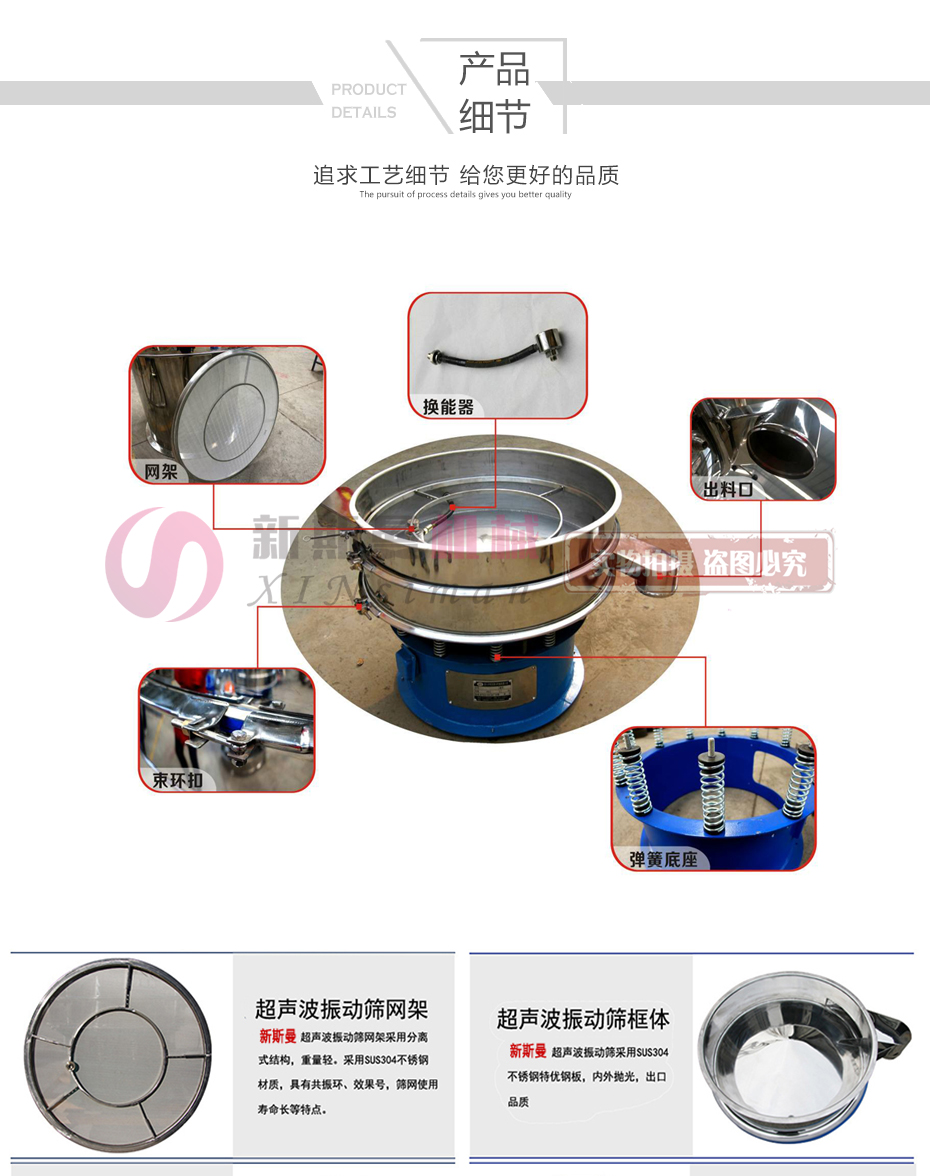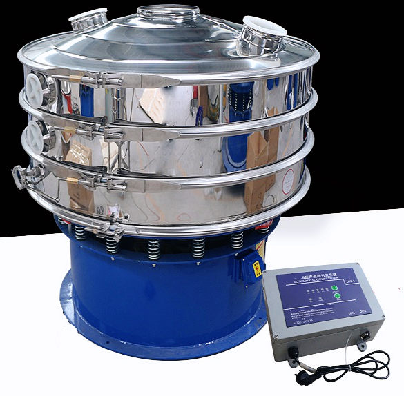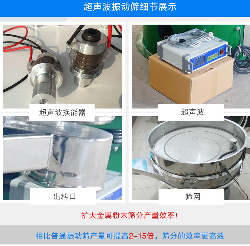 超聲波振動篩是在旋振篩的基礎(chǔ)上引入了超聲波清網(wǎng)裝置,通過將220V、50Hz或110V、60Hz電能轉(zhuǎn)化為18KHz的高頻電能,輸入超聲換能器,將其變成18KHz機(jī)械振動,從而達(dá)到高效篩分和迅速清網(wǎng)的目的,使超微細(xì)粉篩分成為易事。該系統(tǒng)在傳統(tǒng)的振動篩基礎(chǔ)上在篩網(wǎng)上引入一個(gè)低振幅、高頻率的超聲振動波(機(jī)械波),以改善超微細(xì)粉體的篩分性能。特別適合高附加值精細(xì)粉體的用戶使用。超聲波篩分系統(tǒng)是一種簡單實(shí)用、可靠的篩分系統(tǒng),是當(dāng)前網(wǎng)孔堵塞的有效的解決方法。可廣泛應(yīng)用于制藥、冶金、化工、選礦、食品等要求精細(xì)篩分過濾的行業(yè),篩分過濾精度高,有效解決因團(tuán)聚、靜電、強(qiáng)吸附性卡堵網(wǎng)孔等篩分難題,是國內(nèi)篩分行業(yè)的一項(xiàng)重大技術(shù)突破。