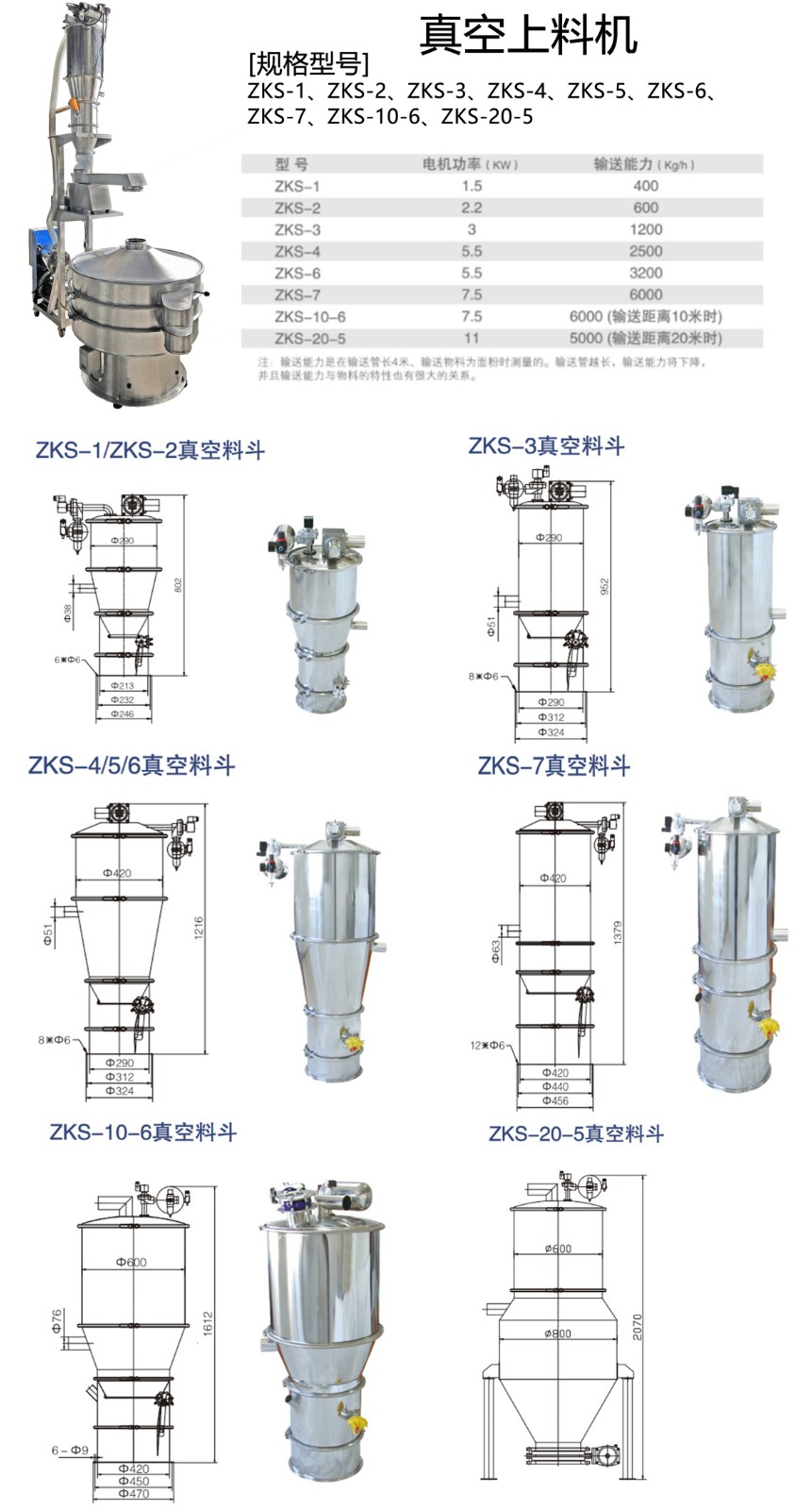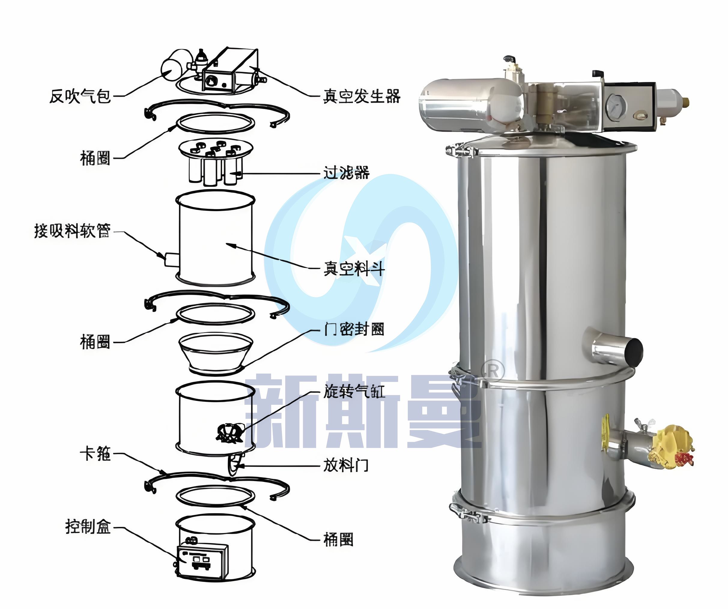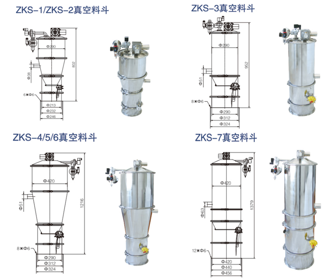 ZKS系列真空上料又稱真空輸送機,是通過氣體產生真空輸送粉體料的設備,是氣體輸送的一種。
