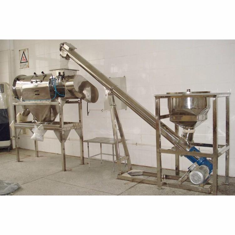 臥式氣流篩篩網為圓筒狀,置于機體內,物料通過螺旋輸送系統后,和氣流混合、霧化進入網筒內;通過網筒內風輪葉片使物料同時受離心力和旋風推進力,從而迫使物料噴射過網,由細料排出口排出,不能過網的物料沿網筒壁從粗料排出口排出。
