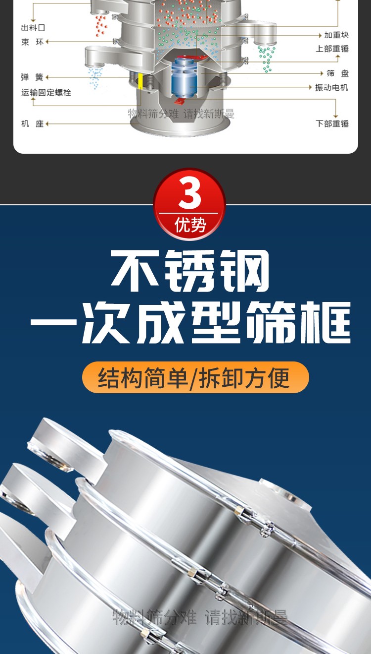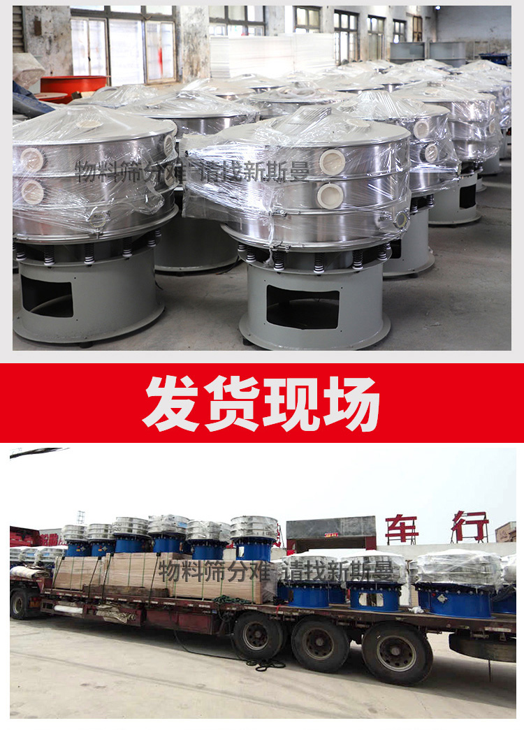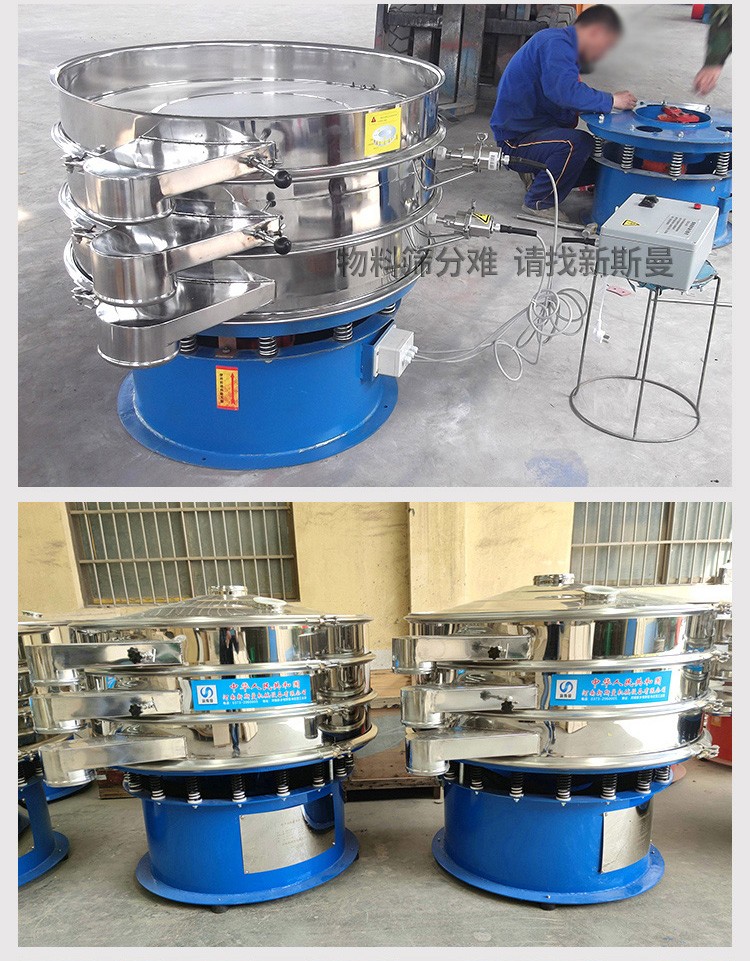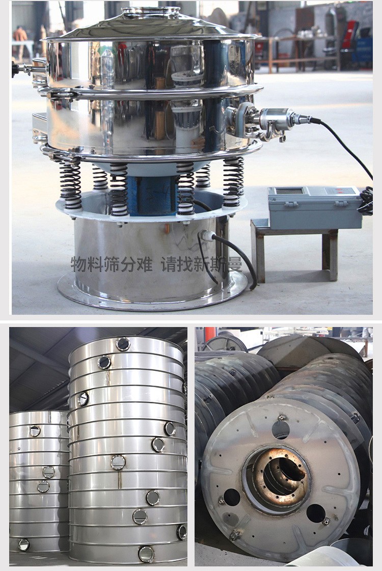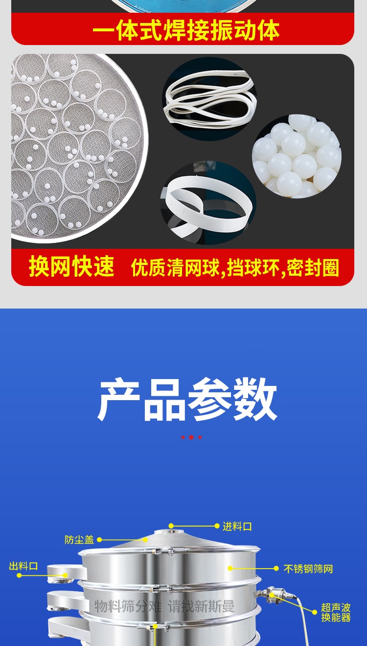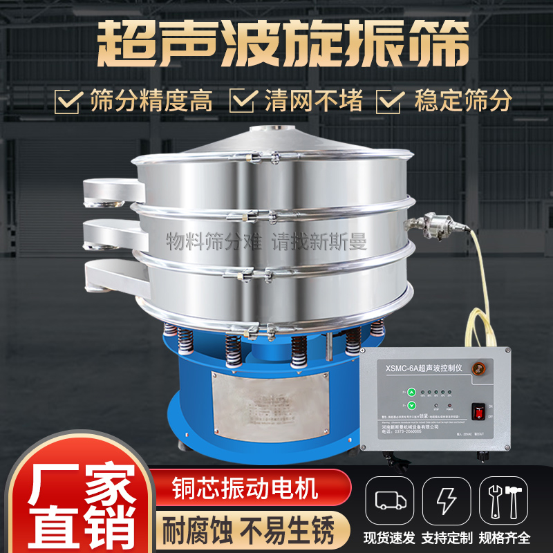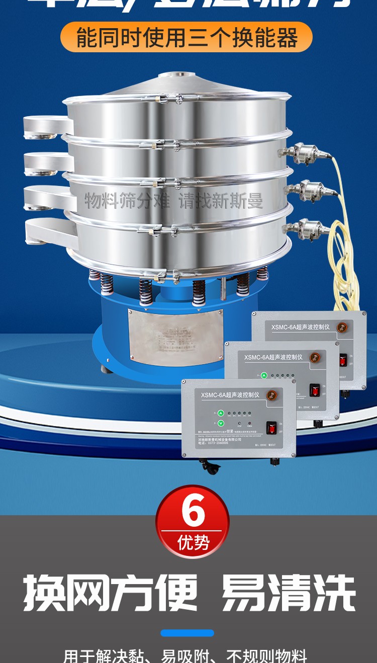 超聲波振動篩是將220V、50Hz或110V、60Hz電能轉化為36KHz的高頻電能,輸入超聲換能器,將其變成36KHz機械振動,產生的功率超聲波使篩網作高頻振動。篩網上的物料在作低頻旋振運動的同時,疊加上超聲振動,既可防止網孔堵塞,又可使篩分機提高產量和質量,從而達到快速篩分和清網的目的,使超微細粉篩分成為易事。該系統在傳統的振動篩基礎上在篩網上引入一個低振幅、高頻率的超聲振動波(機械波),以改變超微細分體的篩分性能。新斯曼系列超聲波旋振篩是在旋振篩基礎上加裝了一套超聲波篩分系統,能有效解決物料:強吸附性、易團聚、高靜電、高精細、高密度、輕比重等篩分難題,具有優越的性能!篩分精度比普通旋振篩可提高1—70%,產量可提高0.5-10倍。干粉粒度可分級到25μm(600目)。特別適合高附加值精細分體的用戶使用。